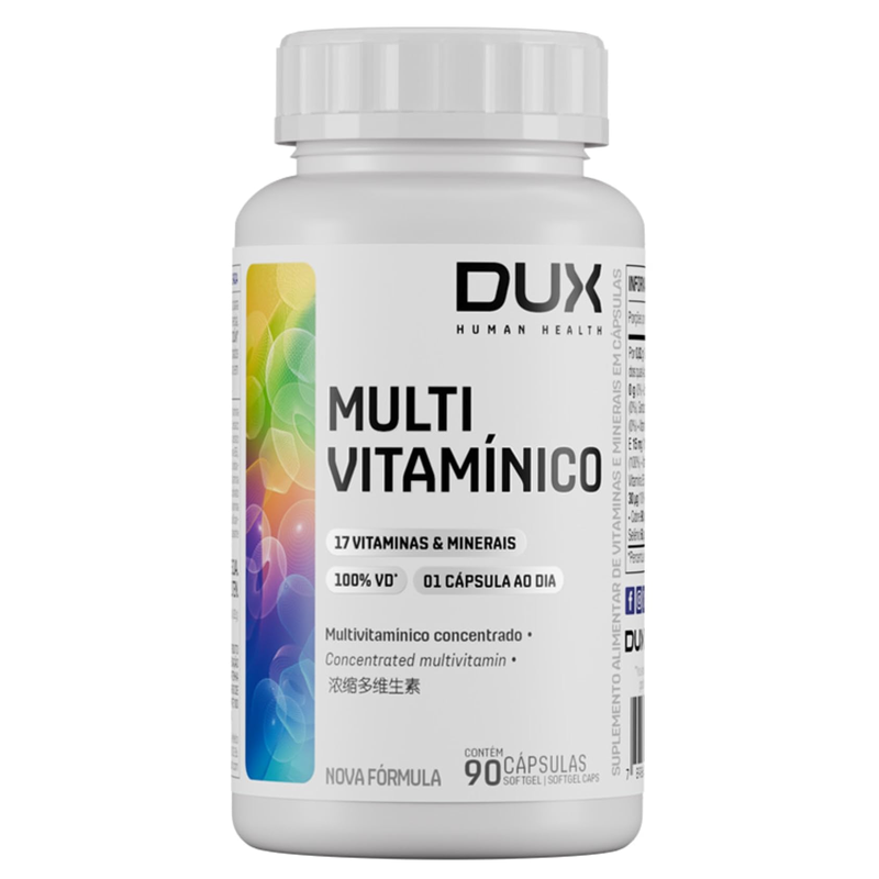 DUX® Multivitamínico é uma fórmula especial que fornece micronutrientes cientificamente selecionados para atender as necessidades específicas do corpo humano, em uma única cápsula ultra concentrada. - Com biodisponibilidade elevada, feito com matéria-prima importada;